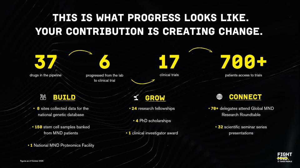 These investments ensure that MND research in Australia remains competitive and world-leading, driving us closer to better treatments and a cure for MND