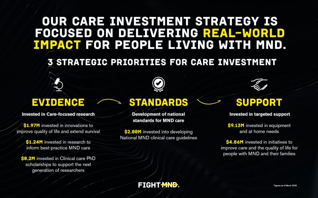 Investment into Care initiatives is equally important. Delivered by the national and state associations, and those caring for those with MND, these initiatives can have a real and positive impact on those affected by MND.